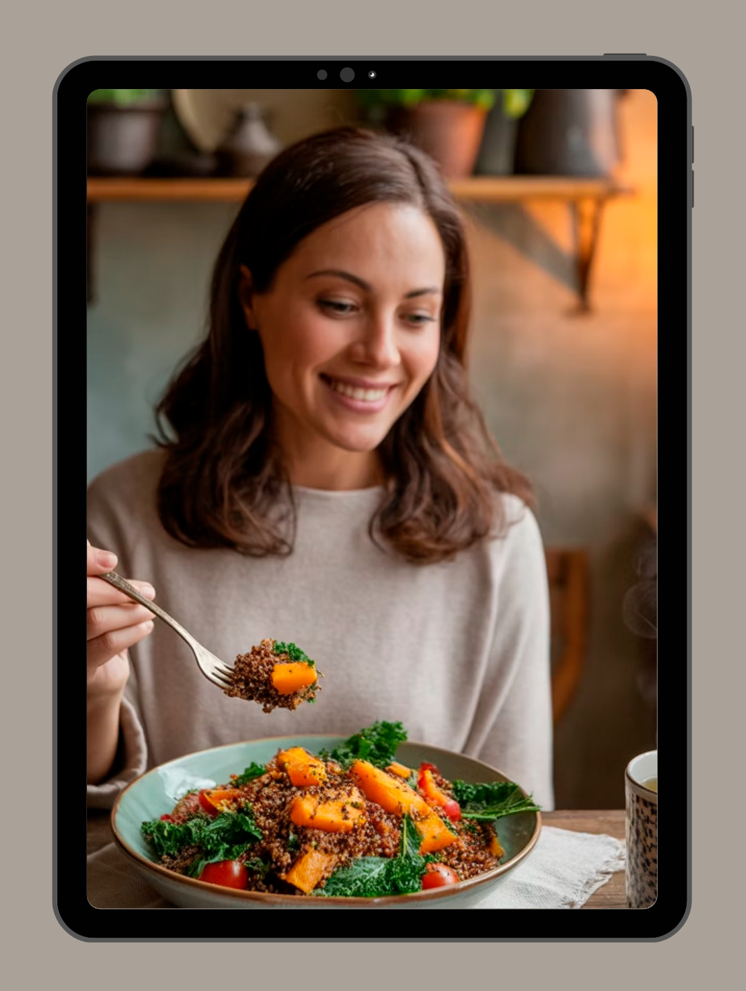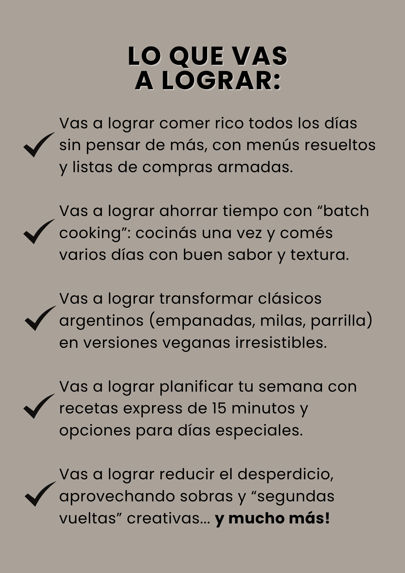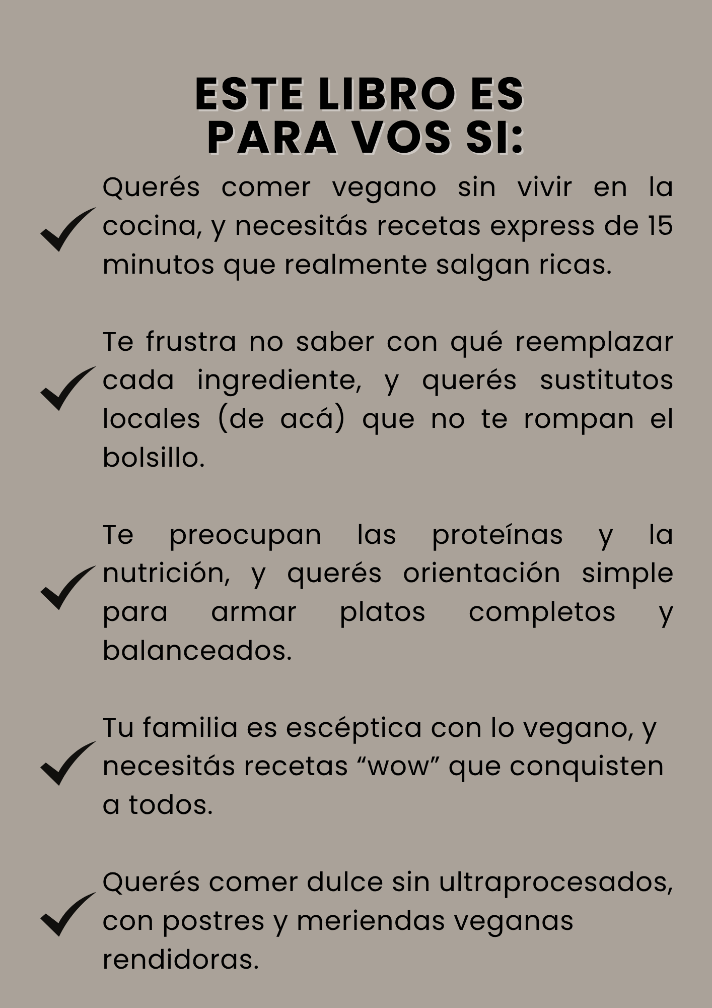 Incluye 200 recetas veganas con opciones express (15 minutos) y menús festivos, más otras recetas incluidas en los Bonos de regalo. Sirve tanto para quienes recién empiezan, como para quienes ya cocinan hace tiempo.