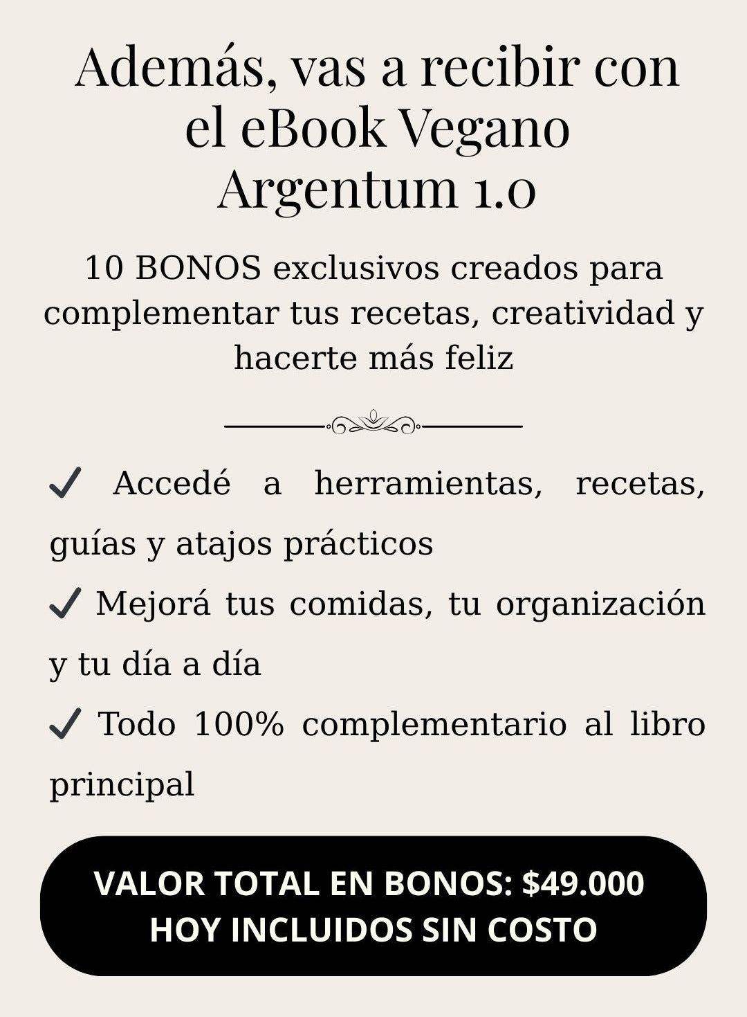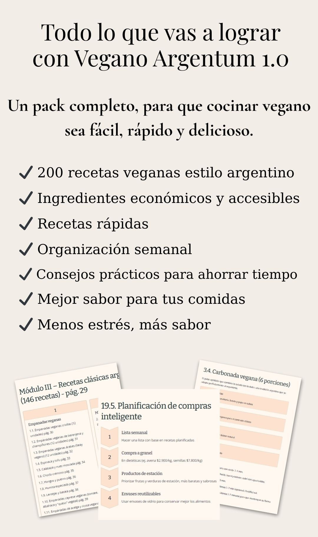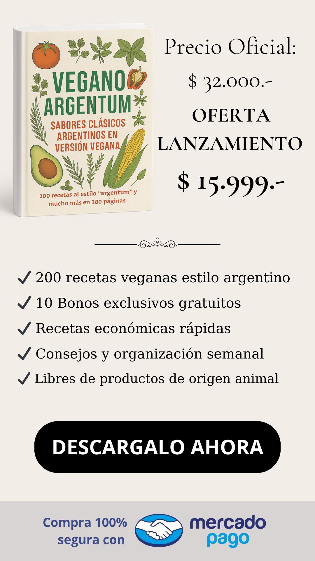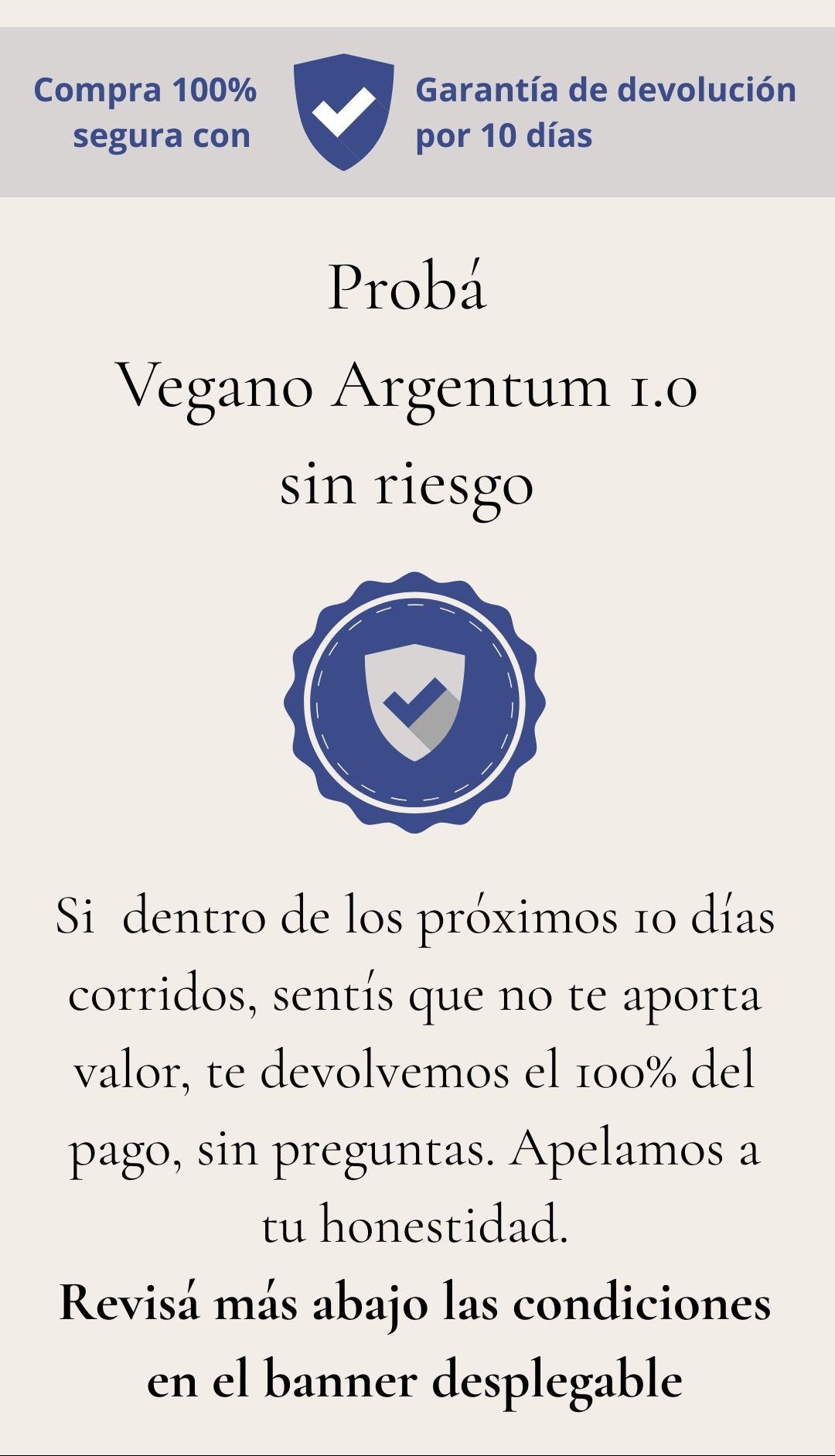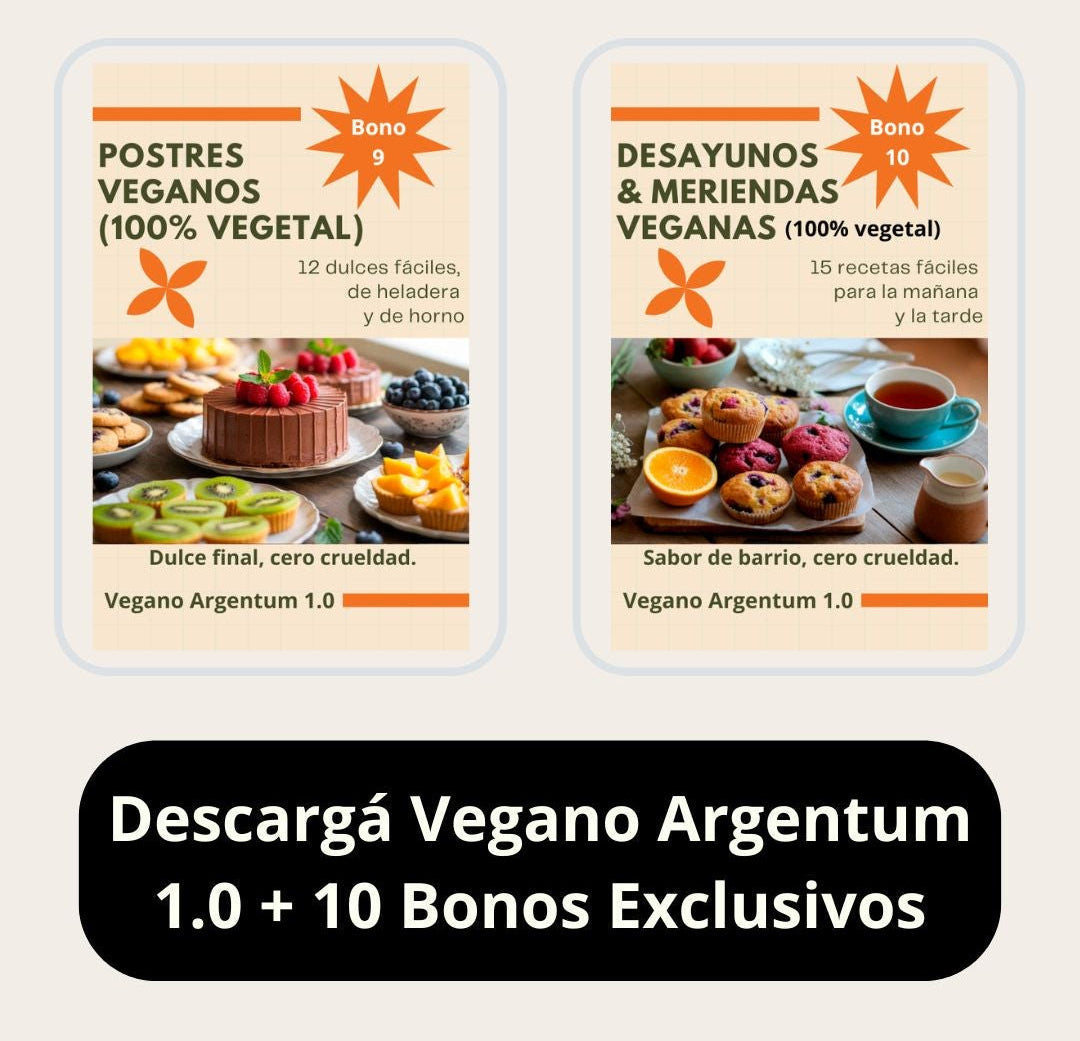 Probá Vegano Argentum 1.0 durante 10 días corridos. Si sentís que no te aporta valor, te devolvemos el 100% del pago, sin preguntas. Apelamos a tu honestidad.